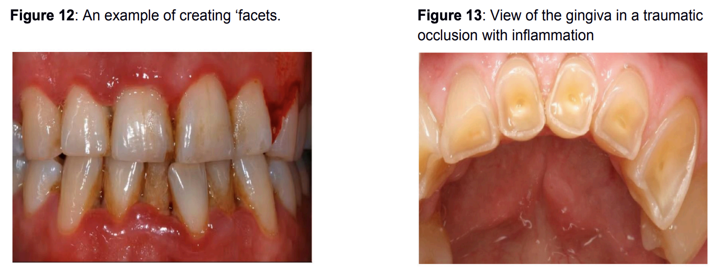 Due to occlusal forces and occlusal trauma, abrasion and inappropriate friction occur between the teeth, resulting in lustrous, flattened areas on the tooth enamel, particularly on the occlusal and incisal surfaces. These teeth in traumatic occlusion may be sensitive to percussion and suffer from chronic pain.