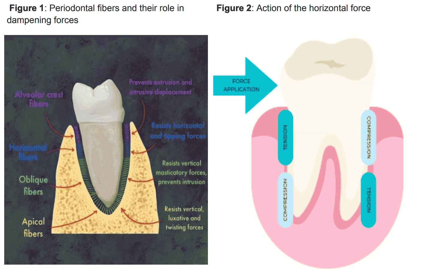 Forces act in a vertical, horizontal or combined direction. Vertical forces act along the tooth’s axis and tend to intrude the tooth into the alveolus. The action of these vertical forces is counteracted by the inclined periodontal fibers.