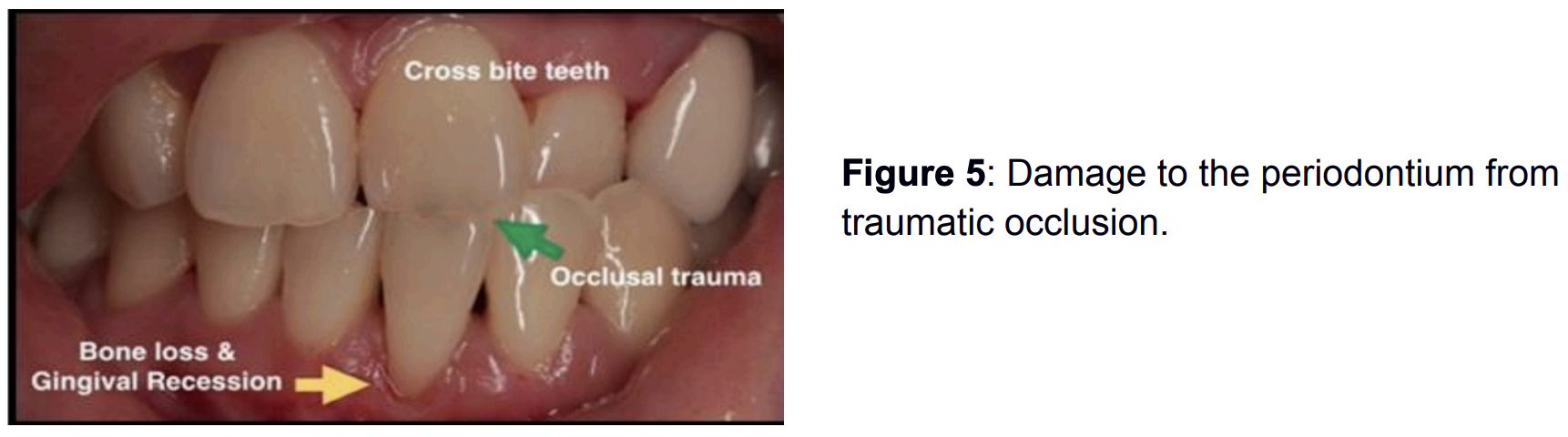 When occlusal forces exceed the physiological limits of the periodontium, the resulting damage is termed trauma from occlusion. This state is often associated with hyperfunction of the periodontium, where excessive, abnormal, or repetitive loads are placed on the teeth, exceeding their capacity to repair or adapt. [3]