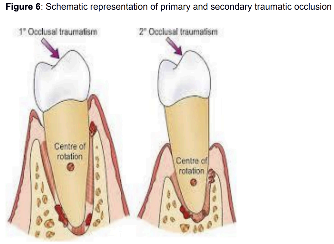 Thus, in these teeth the support is compromised, and even normal functional forces can exacerbate the condition. It differs from primary occlusal trauma, where the tooth support is healthy.