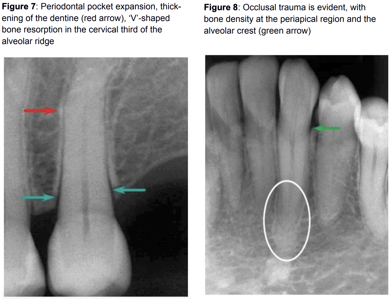 The periodontium cannot adapt when forces exceed its adaptive capabilities. Consequently, changes appear, such as an expansion of the coronal part of the periodontium in the form of a funnel, accompanied by bone resorption around the area. Bone resorption is most pronounced between the roots (furcations). Resorption of the root cementum also occurs. Clinically, these changes manifest as increased tooth mobility and pathological gingival sulcus depth.